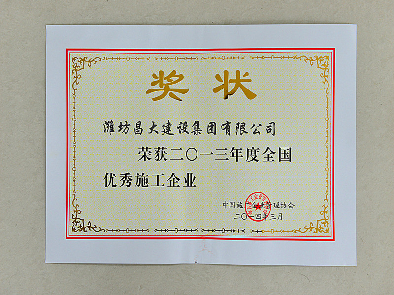 2014年4月18日,中國施工企業(yè)管理協(xié)會第29次年會暨2014年中國施工裝備展覽洽商會在南京召開。會上,對2013年度全國優(yōu)秀施工企業(yè)進(jìn)行了表彰(人民日報(bào)第24008期公示)。集團(tuán)公司榮獲2013年度全國優(yōu)秀施工企業(yè)稱號。