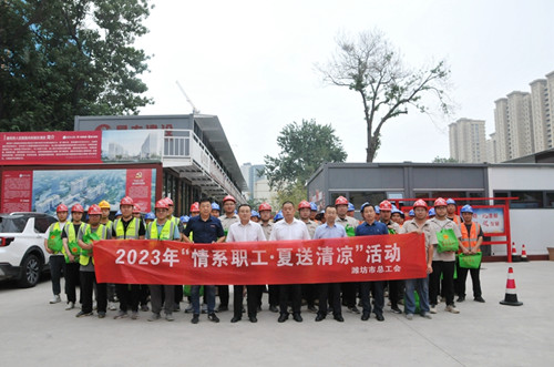 2023年7月12日上午,濰坊市總工會副主席朱建平到集團總承包施工的市重點項目濰坊市人民醫(yī)院項目現(xiàn)場進行了“情系職工?夏送清涼”走訪慰問活動,向廣大一線建設(shè)者表示慰問,并為一建公司、四建公司一線職工發(fā)放清涼物資包(天堂折疊傘、日照綠茶、六神花露水、奇強洗衣粉、舒蕾沐浴露、潔玉毛巾等)。