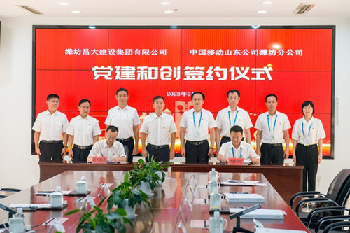 2023年9月13日下午,濰坊昌大建設(shè)集團(tuán)與中國移動(dòng)山東公司濰坊分公司“黨建和創(chuàng)”戰(zhàn)略合作協(xié)議簽約儀式在濰坊移動(dòng)總部辦公樓舉行。集團(tuán)公司黨委書記、董事長徐鵬強(qiáng),濰坊移動(dòng)黨委書記、總經(jīng)理李亞平出席簽約儀式。集團(tuán)公司紀(jì)委書記穆乃杰與濰坊移動(dòng)黨委委員、工會(huì)主席、副總經(jīng)理李廣代表雙方在協(xié)議書上簽字。