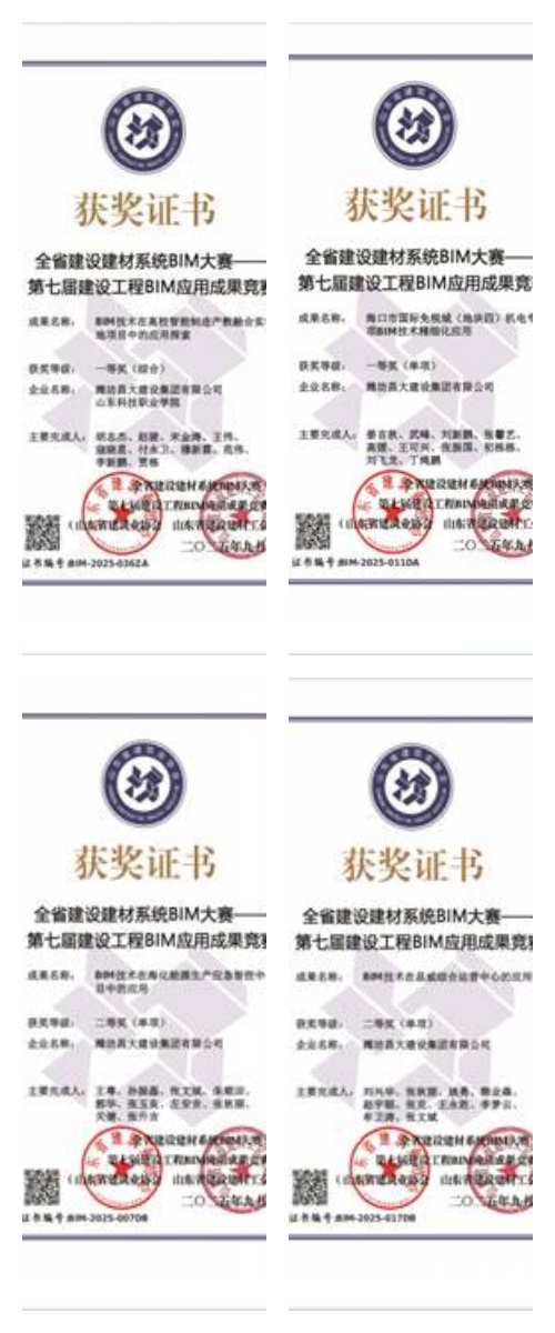 一則是,由山東省建筑業(yè)協(xié)會(huì)與山東省建設(shè)建材工會(huì)聯(lián)合舉辦的2025年第七屆建設(shè)工程BIM應(yīng)用成果競(jìng)賽公布了獲獎(jiǎng)名單,集團(tuán)公司組織申報(bào)的4項(xiàng)成果全部獲獎(jiǎng),其中一等獎(jiǎng)2項(xiàng)、二等獎(jiǎng)2項(xiàng)。
